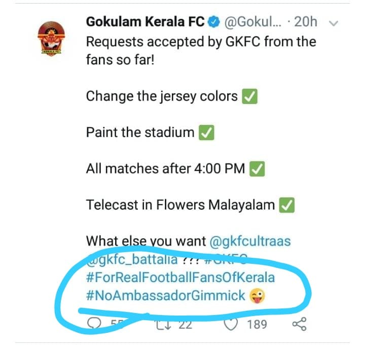 കേരള ബ്ലാസ്റ്റേഴ്‌സ് ആരാധകരുടെ കരുത്ത് ഇത്തവണ അറിഞ്ഞത് ഗോകുലം കേരള എഫ്‌സി. മഞ്ഞപ്പടയെ കളിയാക്കി ട്വീറ്റ് ചെയ്ത ഗോകുലത്തിന്റെ ട്വിറ്റെർ ഹാൻഡിൽ ബ്ലാസ്റ്റേഴ്‌സ് ആരാധകർ പൂട്ടിച്ചു. പുതിയ ബ്രാൻഡ് അംബാസിഡറായി സൂപ്പർ താരം മോഹൻലാലിനെ എത്തിച്ചത് ഗോകുലം കളിയാക്കിയിരുന്നു. നോ അംബാസിഡർ ഗിമ്മിക്ക് എന്ന ഹാഷ്ടാഗ് ഗോകുലം ഉപയോഗിച്ചിരുന്നു. ഇതാണ് ബ്ലാസ്റ്റേഴ്‌സ് ആരാധകരെ കട്ട കലിപ്പിൽ ആക്കിയത്.