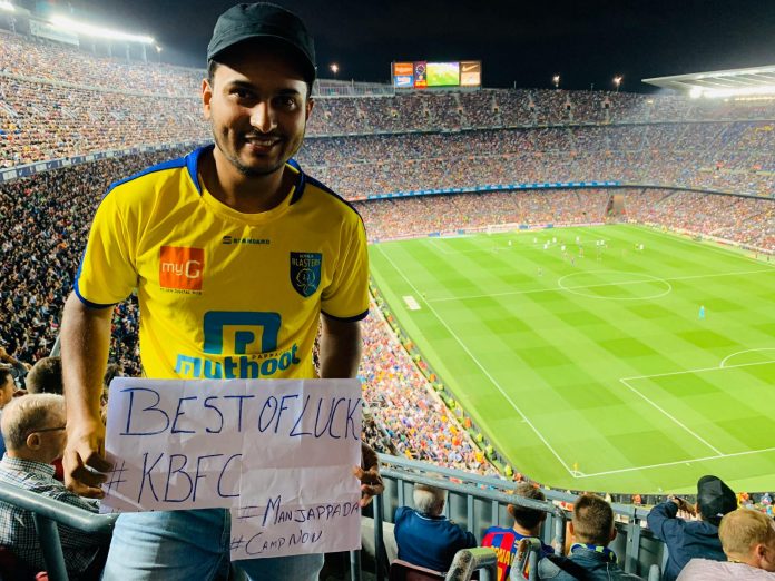 ലോകത്തിന്റെ എല്ലാ മൂലയിലും ഒരു മലയാളി ഉണ്ടെന്നൊരു ചൊല്ലുണ്ട്. അത് മാറ്റി ലോകത്തിന്റെ എല്ലാ മൂലയിലും ഒരു മഞ്ഞേഷ് ഉണ്ടെന്നു മറ്റേണ്ടിയിരിക്കുന്നു. മഞ്ഞപ്പട മെമ്പർ സുജിത്ത് മെസ്സിയുടെ തട്ടകത്തിൽ എത്തി. ബാഴ്സലോണയുടെ ഹോം ഗ്രൗണ്ടായ ക്യാമ്പ് നൗവിൽ കളികാണാൻ എത്തിയതാണ് മഞ്ഞപ്പടയുടെ ആരാധകൻ സുജിത്ത്. ലയണൽ മെസ്സിയുടെ വെടിക്കെട്ട് ഫ്രീ കിക്ക് ഗോള് കാണാനും സുവാരസിന്റെ ബൈസിക്കിൾ കിക്ക് കാണാനും മഞ്ഞപ്പടയുടെ ഈ ആരാധകന് കഴിഞ്ഞ്. അപ്പൊ ഒന്നും നോക്കണ്ട ധൈര്യമായിട്ട് പറയാം