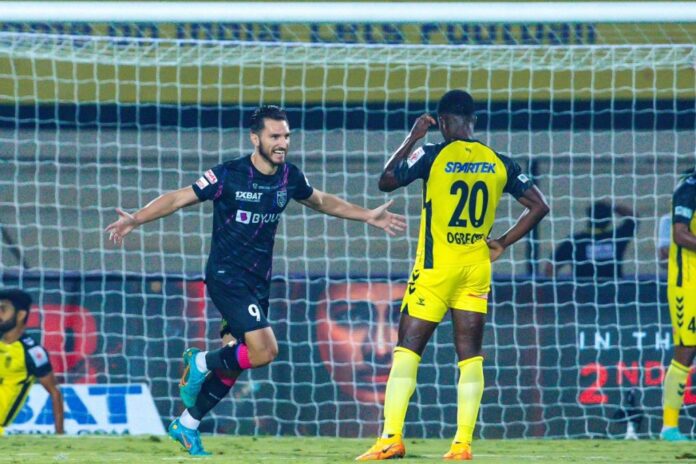 ഹൈദരാബാദിനോട് കടം വീട്ടിക്കൊണ്ട് കേരള ബ്ലാസ്റ്റേഴ്സ്. ഐഎസ്എൽ പോരാട്ടം ആദ്യ പകുതി കഴിയുമ്പോൾ കേരള ബ്ലാസ്റ്റേഴ്സ് ഒരു ഗോളിന് മുന്നിൽ. കളിയുടെ തുടക്കത്തിൽ തന്നെ ഹൈദരാബാദ് ഗോളിയുടെ പിഴവ് മുതലെടുത്ത ദിമിത്രിയോസ് കേരള ബ്ലാസ്റ്റേഴ്സിന് ലീഡ് നൽകി.