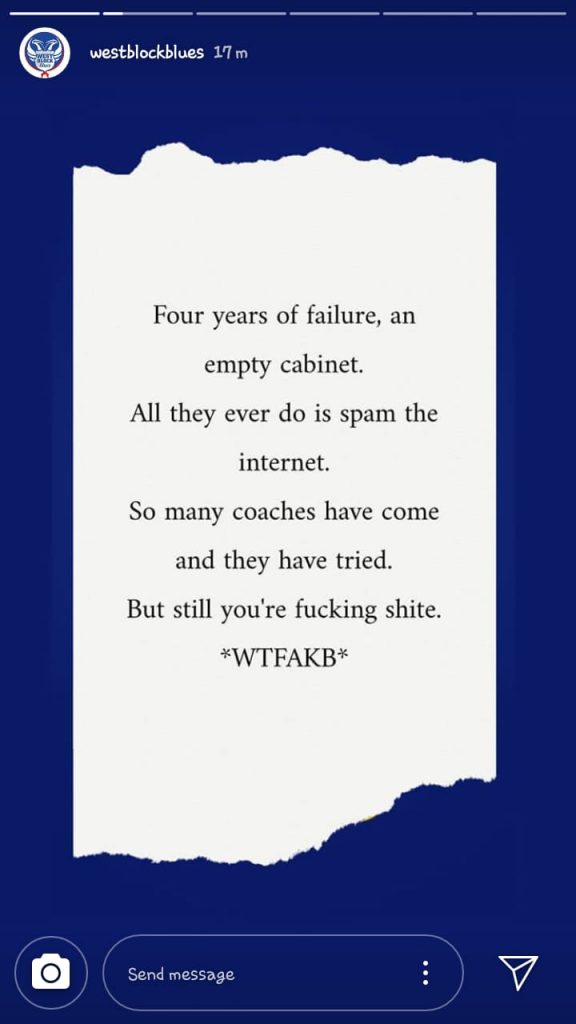 കേരള ബ്ലാസ്റ്റേഴ്സ് ആരാധകക്കൂട്ടായ്മയായ മഞ്ഞപ്പടയെ അപമാനിച്ച് ബെംഗളൂരു എഫ്സിയുടെ ഫാൻസായ വെസ്റ്റ് ബ്ലോക്ക് ബ്ലൂസ്. രൂക്ഷമായ രീതിയിലാണ് സമൂഹമാധ്യമങ്ങളിൽ സ്റ്റോറിയായി വെസ്റ്റ് ബ്ലോക്ക് ബ്ലൂസ് പങ്ക് വെച്ചത്.