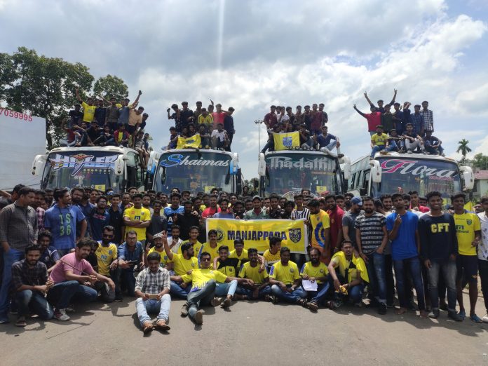 കൊച്ചിയെ മഞ്ഞക്കടലാക്കി കേരള ബ്ലാസ്റ്റേഴ്സ് ആരാധകരായ മഞ്ഞപ്പട. 13 വിംഗുകളിലായി 38 ബസ്സുകളിലാണ് ഐഎസ്എൽ ആറാം സീസണിലെ ഓപ്പണിംഗ് മത്സരത്തിൽ മഞ്ഞപ്പട കൊച്ചിയിലെ ജവഹർലാൽ നെഹ്രു സ്റ്റേഡിയത്തിൽ ആരാധകരെ എത്തിച്ചിരുക്കുന്നത്. സ്റ്റേഡിയത്തിലെ ടിക്കറ്റുകൾ എല്ലാം തന്നെ ഇപ്പോൾ വിറ്റ് തീർന്നിരിക്കുന്നു. ആവേശോജ്വലമായ മത്സരത്തിനായാണ് ബ്ലാസ്റ്റേഴ്സ് ആരാധകർ കാത്തിരിക്കുന്നത്. കരുത്തരായ എടികെയാണ് ബ്ലാസ്റ്റേഴിസിന്റെ എതിരാളികൾ.
