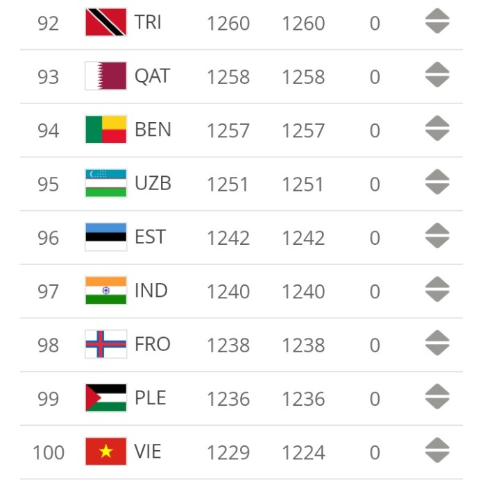 ഫിഫ റാങ്കിങ് പുറത്ത് വന്നു. ഇന്ത്യ 97 ആം റാങ്ക് തന്നെ. രാജ്യാന്തര മത്സരങ്ങൾ ഒന്നും നടക്കാത്തതിനാൽ തന്നെ കാര്യമായ ഒരു മാറ്റവും ഫിഫാ റാങ്കിംഗിൽ ഇത്തവണയില്ല. ഒന്നാം സ്ഥാനത്ത് ബെൽജിയം തന്നെ തുടരുന്നു. ആദ്യ പത്ത് റാങ്കിങ്ങിൽ മാറ്റമേ ഉണ്ടായിട്ടില്ല. ഫ്രാൻസ്,ബ്രസീൽ, ക്രൊയേഷ്യ ഇംഗ്ലണ്ട്, പോർച്ചുഗൽ എന്നി ടീമുകൾ ആണ് ടോപ്പ് സിക്സിൽ. അർജന്റീന ആദ്യ പത്തിൽ ഇത്തവണയും ഇല്ല.