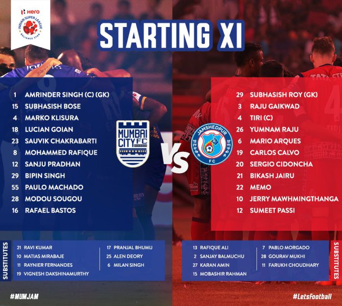 ഇന്ത്യൻ സൂപ്പർ ലീഗ് നാലാം മത്സരത്തിനുള്ള ലൈനപ്പ് പ്രഖ്യാപിച്ചു. മുംബൈ അരീനയിൽ നടക്കുന്ന മത്സരത്തിൽ മുംബൈ സിറ്റിയും ജംഷദ്പൂർ എഫ് സിയുമാണ് നേർക്കുനേർ വരുന്നത്. സ്റ്റാർ പ്ലയേർസ് ആയ ടിം കാഹിലും സുബ്രതാ പോളും ഇല്ലാതെയാണ് ജംഷദ്പൂർ ഇറങ്ങുന്നത്.