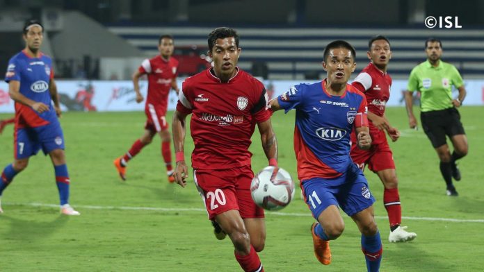 ഇന്ത്യൻ സൂപ്പർ ലീഗിൽ ബെംഗളൂരു എഫ്സി നോർത്ത് ഈസ്റ്റ് യുണൈറ്റഡ് പോരാട്ടം കൊഴുക്കുന്നു. ആദ്യ പകുതിയിൽ പോരാട്ടം മാസ്സയിരുന്നെങ്കിലും ഗോളുകൾ പിറന്നില്ല. ആദ്യ പാദത്തിൽ ഗുവാഹത്തിയിൽ വെച്ച് നേടിയ 2-1ന്റെ നേരിയ വിജയത്തിന്റെ ആത്മവിശ്വാസവുമായാണ് നോർത്ത് ഈസ്റ്റ് ഇറങ്ങിയത്.
