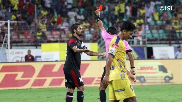 ഇന്ത്യൻ സൂപ്പർ ലീഗിൽ ഇന്ന് നടക്കുന്നത് ബ്ലാസ്റ്റേഴ്സിന്റെ സൂപ്പർ പോരാട്ടം. ആദ്യ പകുതി അവസാനിക്കുമ്പോൾ ഇരു ടീമുകളും ഗോളടിച്ചില്ല. ചുവപ്പ് കണ്ടു നോർത്ത് ഈസ്റ്റ് പത്ത് പേരായി ചുരുങ്ങി. സ്റ്റഹോനോവിചിനെ വീഴ്ത്തിയതിന് ഗുർവീന്ദർ സിംഗ് ചുവപ്പ് കണ്ടു കളം വിട്ടു.