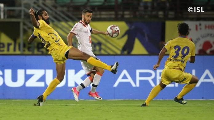 എഫ് സി ഗോവയുടെ പ്രതിരോധത്തെ ഇതുവരെ പരീക്ഷിക്കാൻ ബ്ലാസ്റ്റേഴ്സിനായില്ല. കളിയുടെ 11ആം മിനുട്ടിൽ തന്നെ എഫ് സി ഗോവ ലീഡ് എടുത്തിരുന്നു. ഗോവയുടെ സൂപ്പർ താരം കോറോ തന്നെ ആയിരുന്നു ഗോളുമായി എത്തിയത്. അഹ്മദ് ജാഹോ കൊടുത്ത ക്രോസ് ഹെഡ് ചെയ്ത് കോറോ ആദ്യ ഗോൾ നേടി. ആദ്യ പകുതിക്ക് മത്സരം പിരിയുന്നതിനു മുൻപേ ബോക്സിന് പുറത്തു നിന്നുള്ള സ്ട്രൈക്കിലാണ് കോറോ രണ്ടാം ഗോൾ നേടിയത്.
